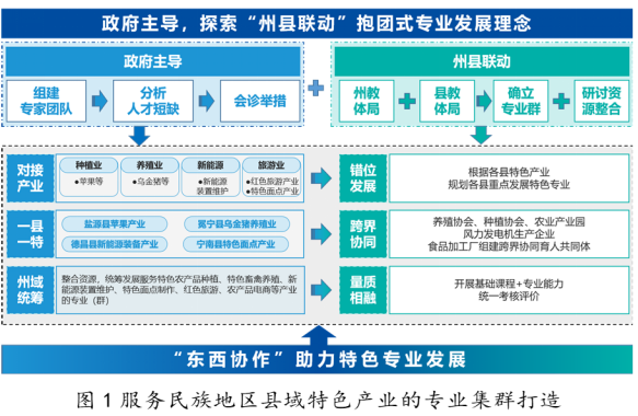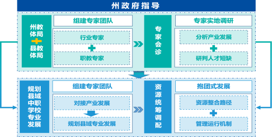 州县联动:州教体局组织各县教体局联合研讨,结合各县产业布局,分析产业链上中下游关键环节和核心岗位技能人才需求情况,统筹研讨各县域职业学校专业群发展规划,形成专业群“错位发展”格局,打破县域间资源共享壁垒,“集优共享”建好服务县域经济发展的特色优质专业群。
